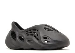 The adidas Yeezy Foam Runner βOnyxβ applies a sleek monochrome finish to the futuristic slip-on. Black injected EVA foam is utilized on the molded one-piece upper, featuring sculpted lines and a series of strategically mapped vents that allow for increased airflow. A contoured heel provides a secure fit, while the soft top layer of the footbed delivers step-in comfort. The lightweight build is underpinned by a wavy-traction outsole that offers sure footing on wet or dry surfaces.