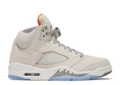 The Air Jordan 5 Retro SE โCraftโ updates the legacy silhouette with a subtle color palette and a refreshed build. Crafted from taupe-colored suede and textile, the upper is secured with two-tone laces and accented with translucent quarter-panel netting. Orange textile lines the tongue, matching the signature Jumpman that decorates the exterior. A second Jumpman icon graces the heel overlay in grey embroidery. The mid-top rides on an off-white polyurethane midsole, featuring speckled shark-tooth detailing and a visible Air-sole unit in the heel. Underfoot, a translucent herringbone-pattern rubber outsole yields superior stop-and-go traction.