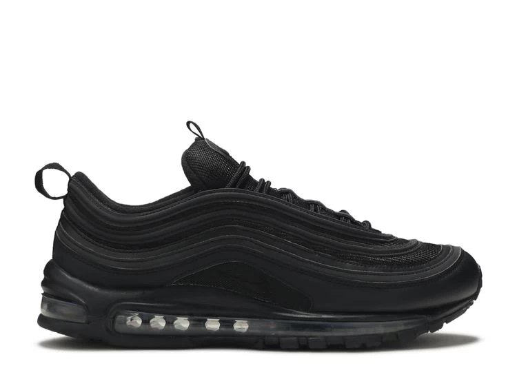 The Nike Air Max 97 sneaker represents the ingenuity that personifies the Swoosh brand with its water ripple-inspired silhouette. This 'Triple Black' iteration lives up to the legacy of the AM97 as a lifestyle icon, dressed in premium leather and mesh materials. 3M Scotchlite strips add a striking ingredient to the monochromatic upper. A multi-window Air midsole and abrasion-resistant traction remain faithful to the original design.