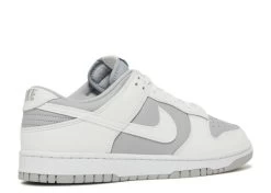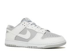 The Nike Dunk Low ‘White Neutral Grey’ treats the vintage hoops shoe to a subdued makeover devoid of color. The upper combines a grey tumbled leather base with smooth white leather overlays and a color-matched Swoosh. Standard Nike branding hits appear on the woven tongue tag, leather back tab, and sockliner. The sneaker is underpinned by a traditional rubber cupsole, featuring stitched sidewall construction and an interior foam wedge for lightweight cushioning.