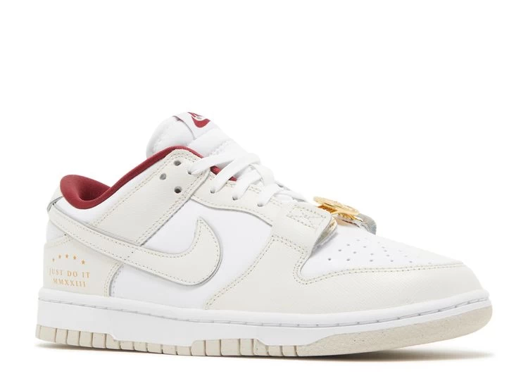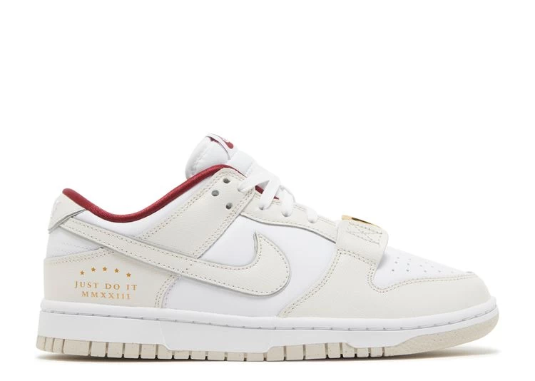 The Nike Women’s Dunk Low SE ‘Sisterhood’ showcases a subdued two-tone design celebrating women in sports. Textured leather is deployed on the upper, featuring a white base with cream-colored overlays and a matching signature Swoosh. Contrasting Team Red accents make their way to the interior lining and woven Nike tongue tag. Pendant-shaped lace jewels shine in metallic gold, while ‘Just Do It MMXXIII’ inscribed on the latera heel gold-foil lettering. Anchoring the sneaker is a traditional cupsole that pairs white sidewalls with a tan rubber outsole.