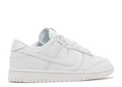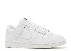 The Nike Women’s Dunk Low ‘Triple White’ gives the retro hoops shoe a pristine makeover devoid of color. Smooth white leather is utilized on the upper, featuring hallmark details that include stitched overlays, a perforated toe box, and a padded low-cut collar. A Nike wordmark is embroidered on the heel tab in tonal lettering, while a black-on-white Nike tag adorns the breathable nylon tongue. The sneaker rests on a durable rubber cupsole in a matching white finish.