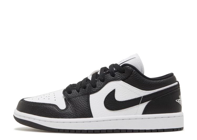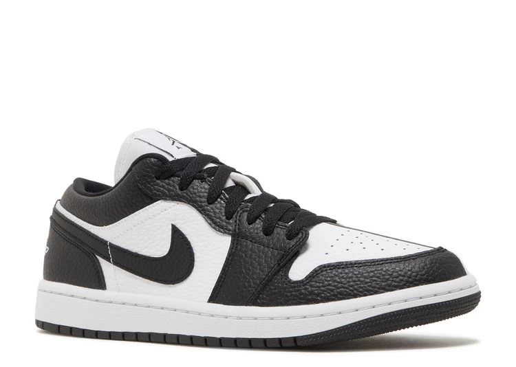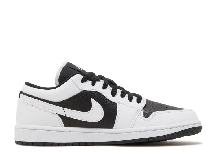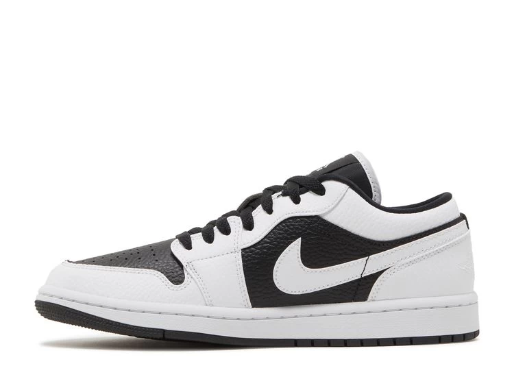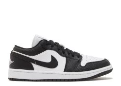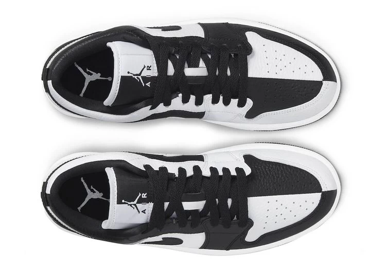 The women’s Air Jordan 1 Low SE ‘Homage’ showcases split color blocking that recalls the ‘Homage to Home’ Air Jordan 1 High from 2018. The tumbled leather upper on each shoe features a white base with contrasting black overlays on the lateral side, and a black base with white overlays on the medial side. The split theme extends to the Jumpman tongue tag and the Wings logo embroidered on the heel. Both shoes are mounted on a rubber cupsole, highlighted by white sidewalls and a black rubber outsole.